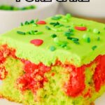 A festive Grinch Poke Cake with bright green cake, red cheesecake pudding filling, and fluffy frosting. It’s an easy holiday dessert that’s perfect for Christmas parties and the sweetest way to spread holiday joy.