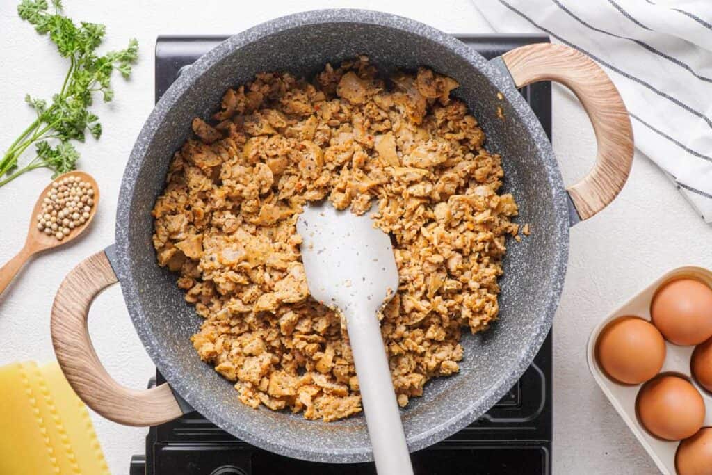- Brown meat, breaking apart as you cook. Drain and return to pan.