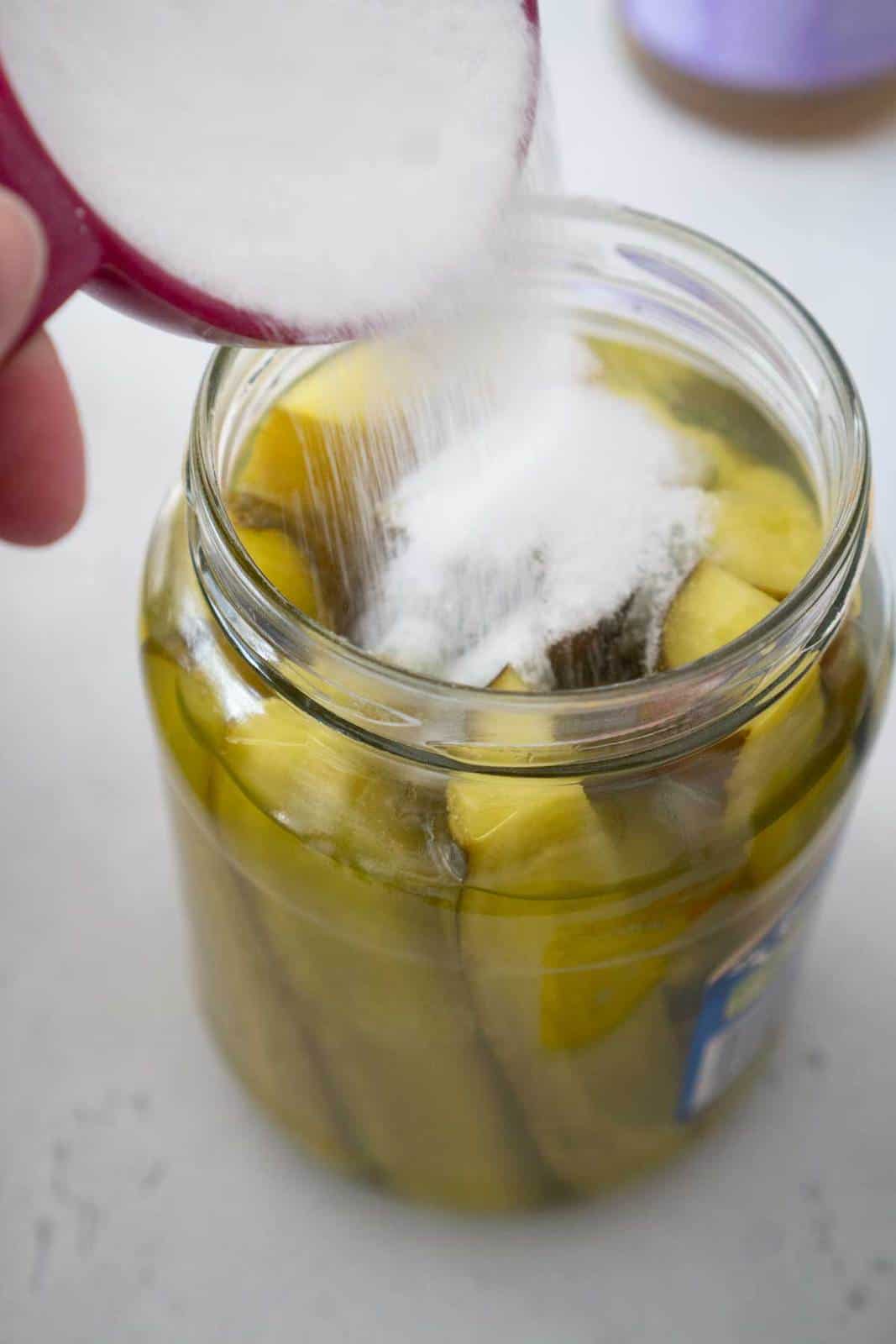 - Close the jar tightly and shake vigorously until the sugar dissolves into the pickle liquid.