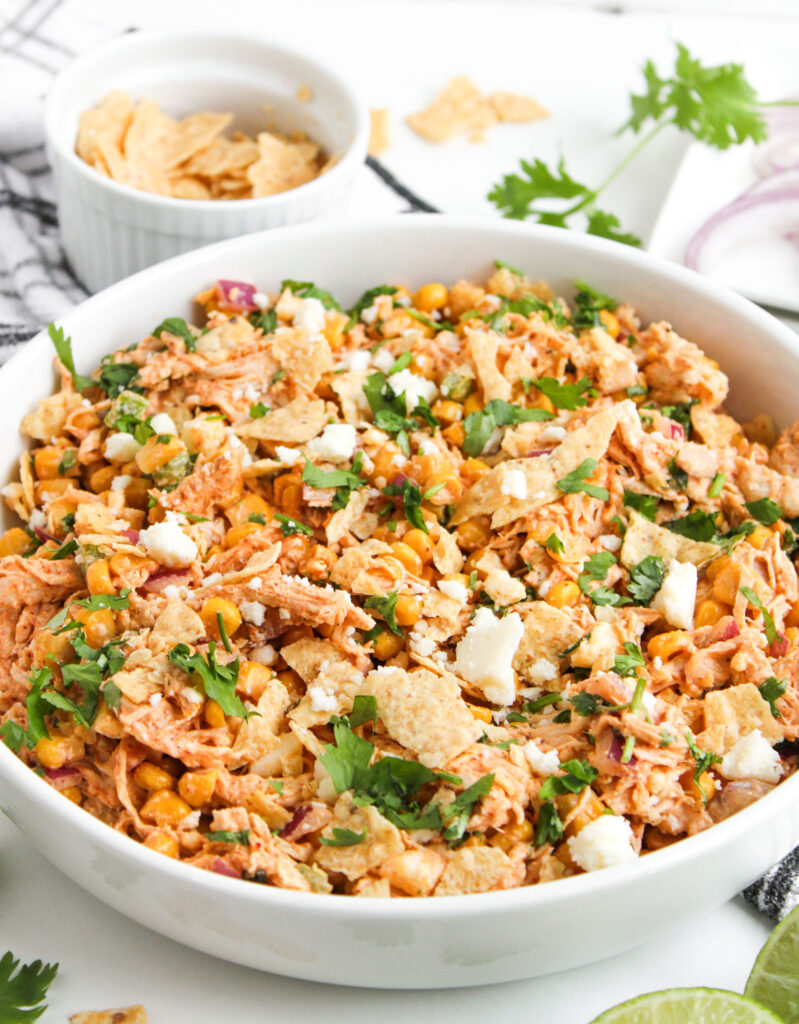 Street Corn Chicken Salad is inspired by classic Mexican street corn but turned into a hearty, scoopable meal. It combines shredded chicken, fire roasted corn, creamy dressing, fresh lime, and just enough spice to keep things interesting.