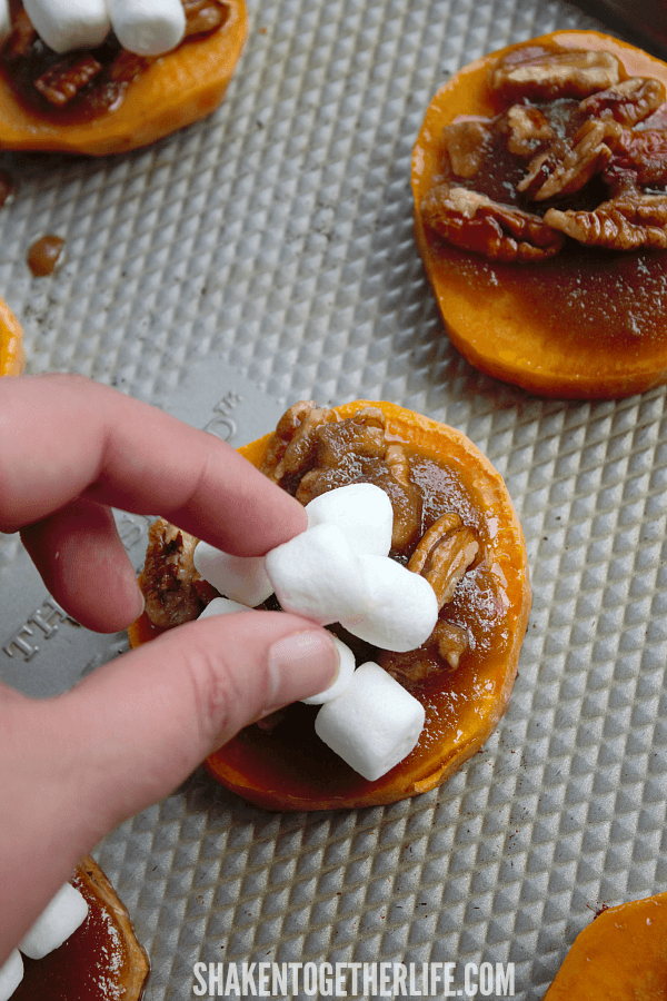 - Add 5 or 6 mini marshmallows on top of the brown sugar pecan mixture.