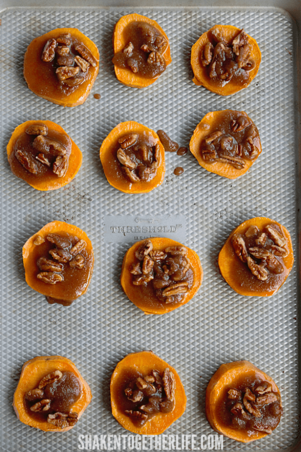 - Divide brown sugar pecan mixture over the tops of the roasted potato rounds.