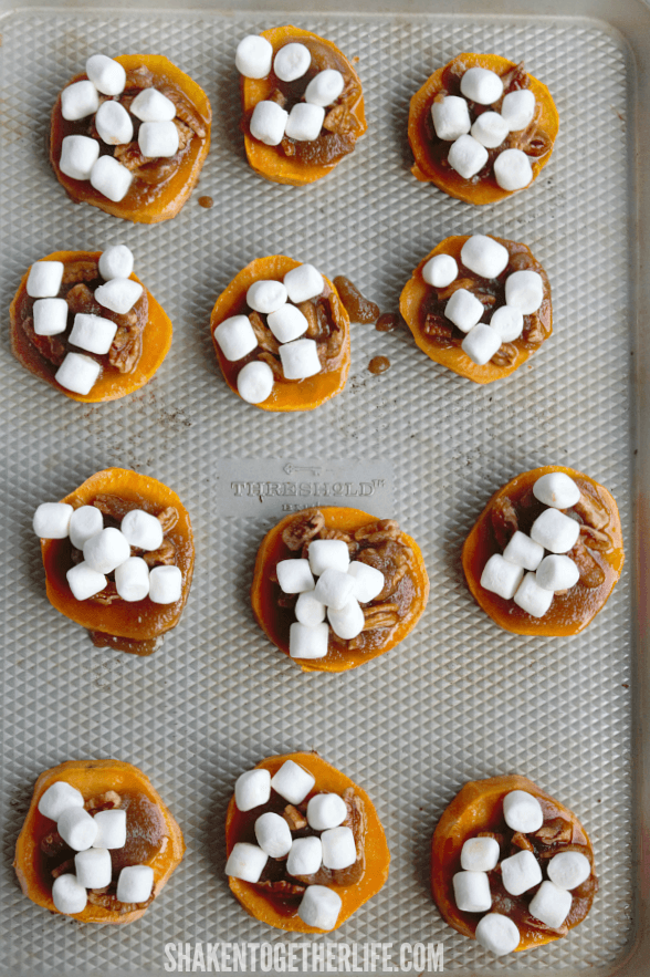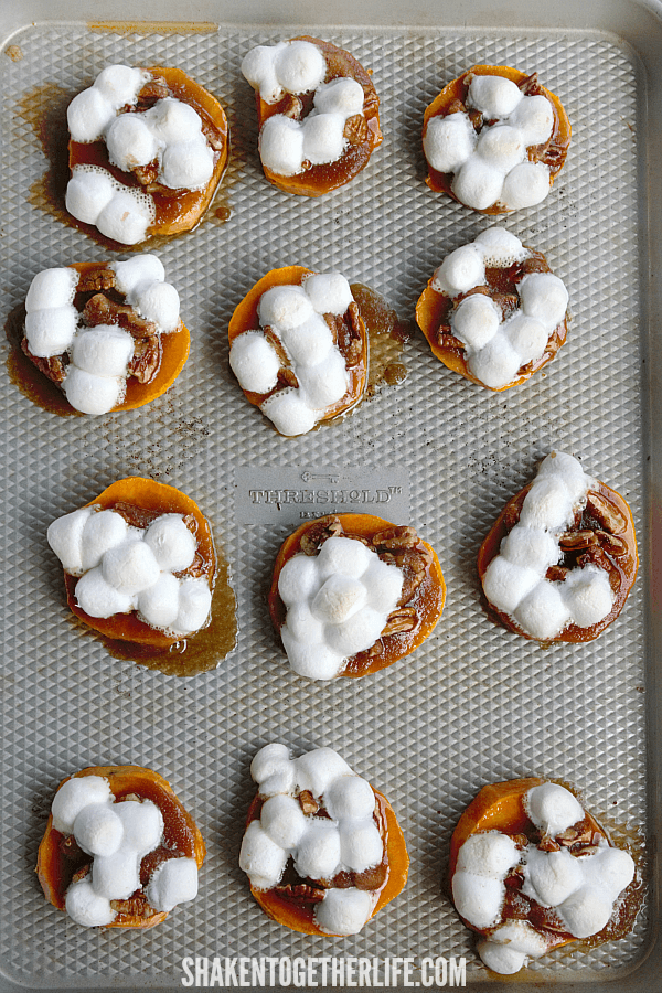 Sweet potato rounds are roasted, then topped with butter, brown sugar, pecans, and mini marshmallows – it’s the best of sweet potato casserole in a few delectable bites. No longer just a lumpy bumpy side dish … these sweet potato casserole bites will absolutely steal the show!